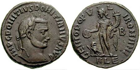 Alexandria | Domitius Domitianus Billon Follis. Alexandria mint. IMP C L DOMITIVS DOMITIANVS AVG, laureate head right / GENIO POPV-L-I ROMANI, Genius standing left, pouring liquid from patera and holding cornucopiae, eagle with wings spread at foot left, Γ in right field. Mintmark ALE. Cohen 1; RIC 20; Sear 12980. | Text | Image |