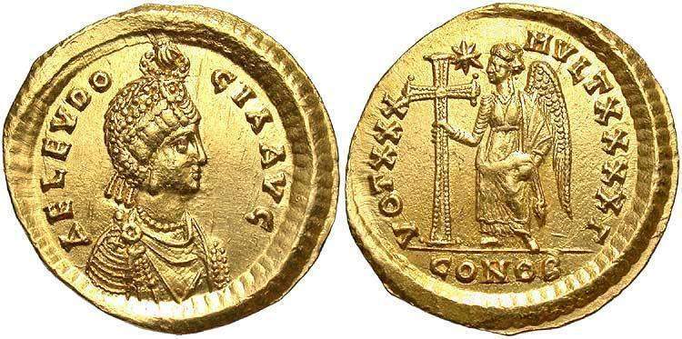 | RIC X 256 | AV Solidus. 20mm x 22mm, 4.45g. AEL EVDOCIA AVG, diademed and draped bust right, hand of God holding wreath above / VOT XX MVLT XXX and officina letter, Victory standing left, holding long cross. Star in upper left field. Mintmark CONOB. RIC X, 256; Depeyrot 82/1; Sear '88 4299. | Text |  |