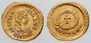 | RIC X 335 | Aelia Eudocia AV Tremissis. Early 440s AD, Constantinople mint. AEL EVDOCIA AVG, diademed & draped bust right / Cross within wreath (wreath ties type 11); CONOB star. | Text |  |