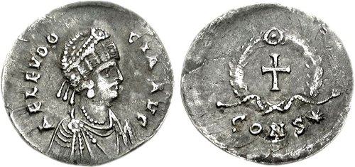 | RIC X 387 | Eudocia, AR Siliqua, 16mm, 2.19g. Constantinople. AEL EVDO-CIA AVG, pearl-diademed, draped bust right / No legend, cross within wreath, (wreath ties type Sear 9). Mintmark CONS star. RIC X 387. | Text |  |