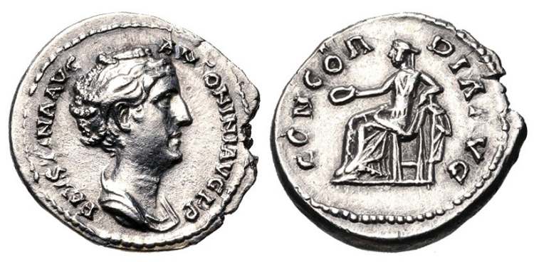 | RIC 327 type 2 | Faustina I. AR denarius, AD 129-131 (lifetime issue). Rome. Struck AD 139. 18 mm, 3.56 g. FAVSTINA AVG ANTONINI AVG PP, draped bust right / CONCORDIA AVG, Concordia seated left, holding patera in right hand and resting left arm on a cornucopiae. RIC 327 type 2 (note); Cohen 150; RSC 146. | Text | Image |