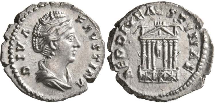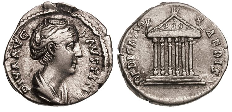 | RIC 343 BMCRE 341 | Faustina I, AR Denarius, AD 141-161. 17.37 mm, 3.6 g. DIVA FAVSTINA, draped bust right, hair elaborately waved and coiled, with bands across the head, drawn up at the back and piled in a round coil on top / AED DIV FAVSTINAE, hexastyle temple with cult statue of Faustina within, fencing before, facing quadriga on the pediment, Victories as acroteria, male statues holding sceptres to left and right. RIC III 343; BMCRE IV 341; Cohen 1; RSC 1; Sear 4573. | Text | Image |