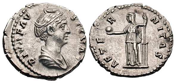 | RIC 348 Sear 4577 | Diva Faustina I Denarius. DIVA FAVSTINA, draped bust right / AETERNITAS, Fortuna standing left, holding globe and rudder. RIC 348; RSC 6. | Text | Image |