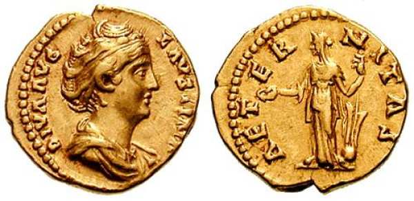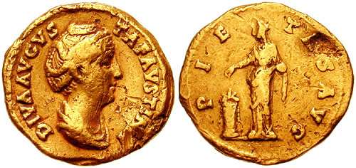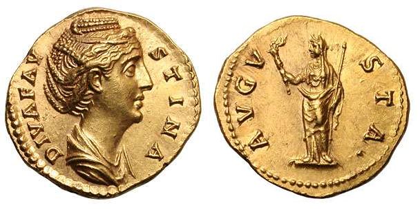 | RIC 372 Sear 4556 | Diva Faustina I AV Aureus. DIVA FAVSTINA, draped bust right / AVG-V-STA, Fortuna standing left, holding patera in right hand and rudder resting on globe in left. | Text | Image |