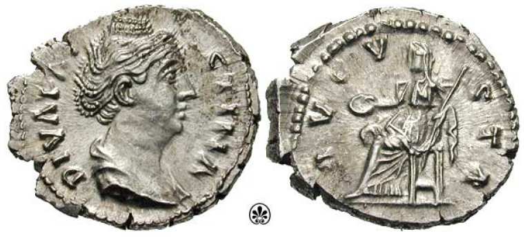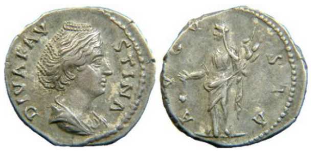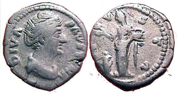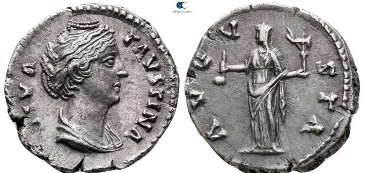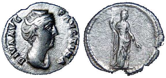 | RIC 344 Sear 4568 | Diva Faustina I Denarius. DIVA FAVSTINA, draped bust right / AETERNITAS, Juno standing left, hand raised, holding sceptre. RIC 344; RSC 26; BMCRE 345. | Text | Image |