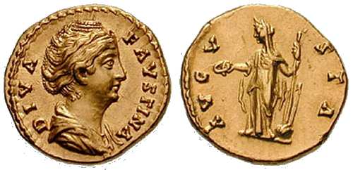 | RIC 356, Aureus Sear 4553 | Diva Faustina I AV Aureus. DIVA FAVSTINA, diademed and draped bust right / AVGVSTA, Ceres standing left, holding short torch in right hand, sceptre in left. Cohen 95. | Text | Image |