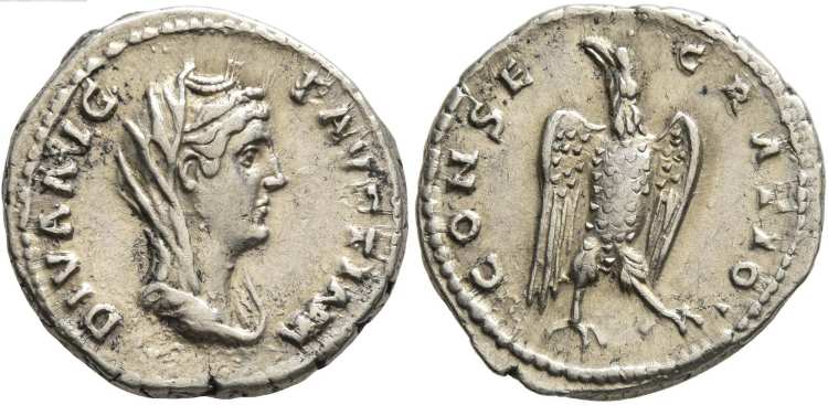 | RIC 387 Sear 4595 | Faustina I AR denarius, posthumous issue. Struck after AD 140-141. 17 mm, 3.23 g. DIVA AVG FAVSTINA, draped and veiled bust right. / CONSECRATIO, eagle standing right, wings spread, head left. RIC 387b; RSC 181. | Text | Image |