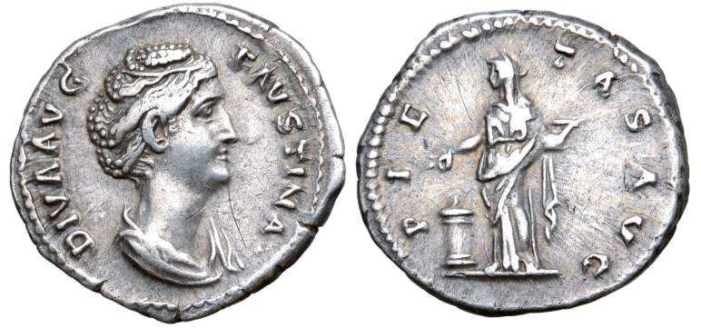 | RIC 374 | Faustina I denarius. DIVA FAV-STINA, draped bust right / AVGVSTA, Pietas standing left with raised hand, altar at foot left. | Text | Image |