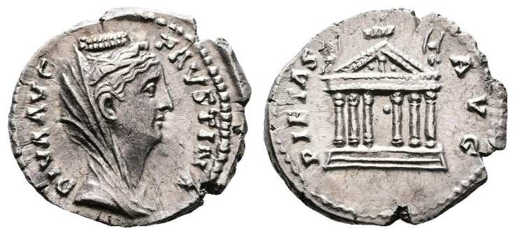 | RIC 396 Sear 4599 | Faustina I Denarius. DIVA AVG FAVSTINA, draped bust right / PIETAS AVG, Hexastyle temple with two statues of Victory on pediment. BMCRE 319; RSC 253; RIC III, 396. | Text | Image |