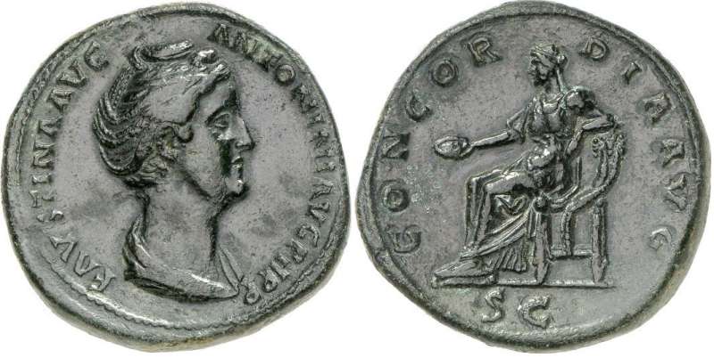 | RIC 1074 Sear 4673 | Faustina I AE sestertius. Lifetime issue. FAVSTINA AVG ANTONINI AVG PII P P, bust right / CONCORDIA AVG S-C, Concordia seated left with patera and leaning on cornucopiae. Cohen 147. | Text | Image |