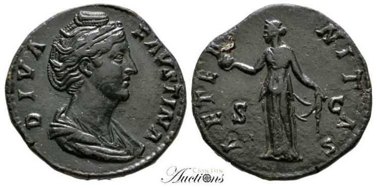 | RIC 1102 Sear 4605 | Diva Faustina I AE Sestertius. After 146 AD. DIVA FAVSTINA, draped bust right / AETERNITAS S-C, Juno standing front, head left, raising right hand and holding sceptre. Cohen 28. | Text | Image |