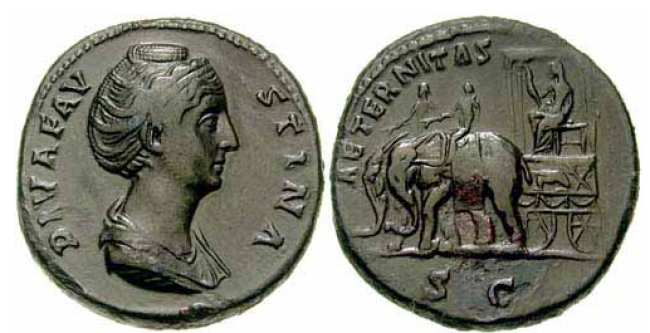 | RIC 1113 Sear 4611 | Diva Faustina I AE Sestertius. DIVA FAVSTINA, draped bust right / AETERNITAS, SC in ex, Faustina, veiled and holding sceptre, seated in carpentum drawn by two elephants guided by drivers. Cohen 57. | Text | Image |