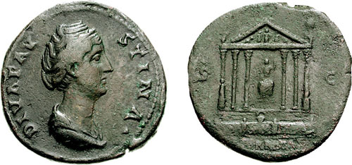 | RIC 1115 Sear 4613 | Diva Faustina I AE Sestertius. DIVA FAV-STINA, draped bust right / S-C, AETERNITAS below, hexastyle temple with Faustina seated facing within. Cohen 65. | Text | Image |