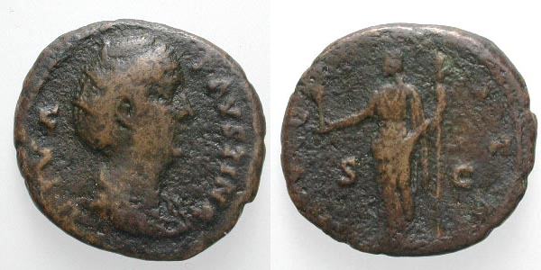 | RIC 1190 | Faustina I AE Dupondius or As. DIVA FAVSTINA, draped bust right / IVNO S-C, Juno standing left, holding patera and sceptre. Cohen 211. | Text | Image |