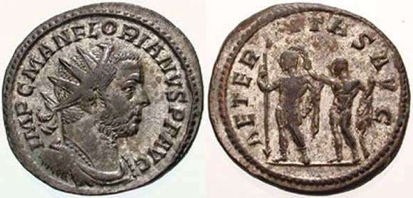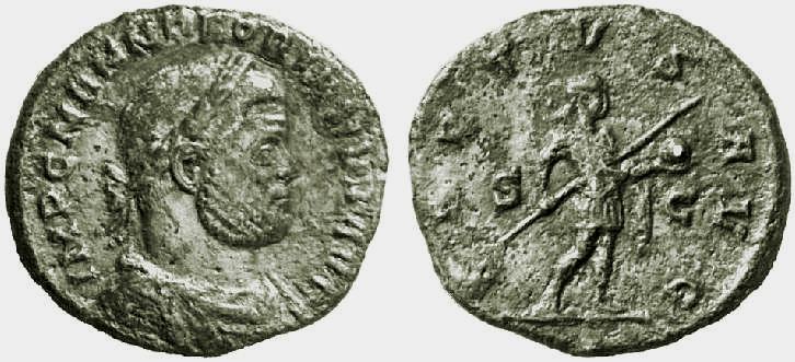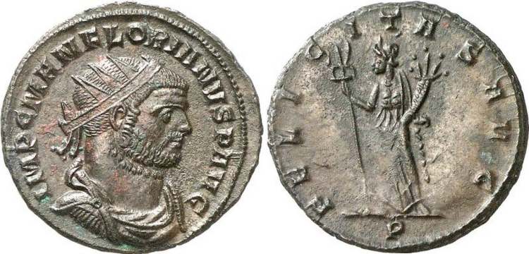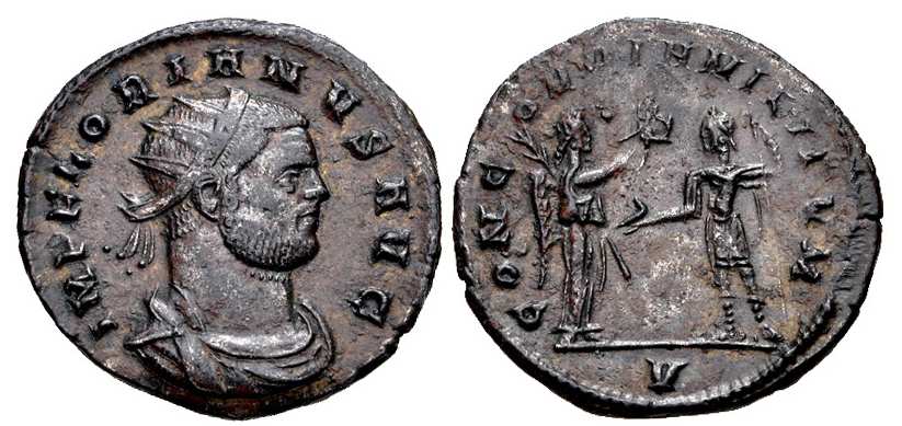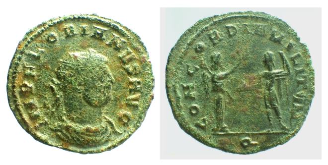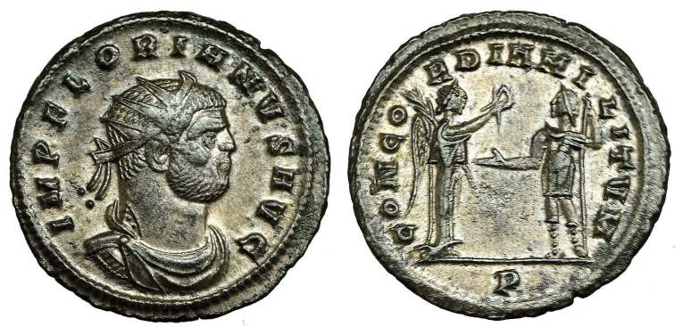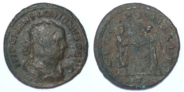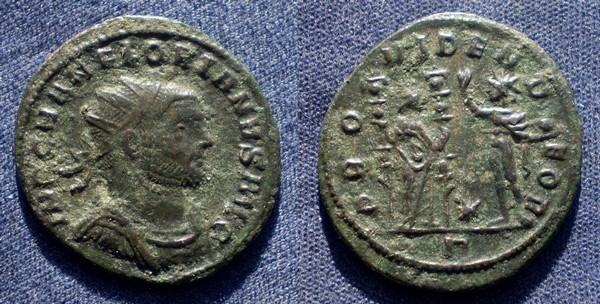 | RIC 116, P | Florian AE Antoninianus. Cyzicus, AD 276. IMP FLORIANVS AVG, radiate, draped and cuirassed bust right / CONCORDIA MILITVM, Victory standing right, presenting wreath of victory to Florian standing opposite, holding spear. Cohen 15. | Text | ![]() |