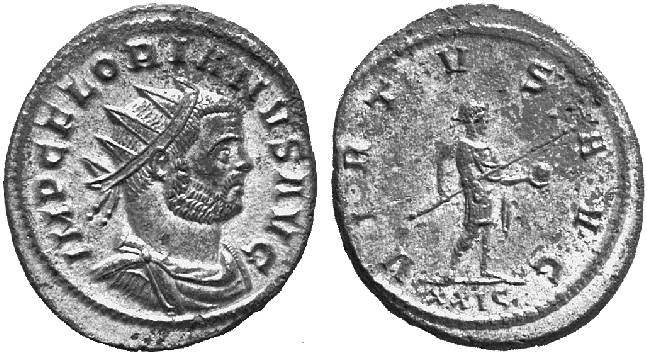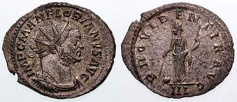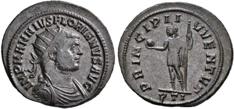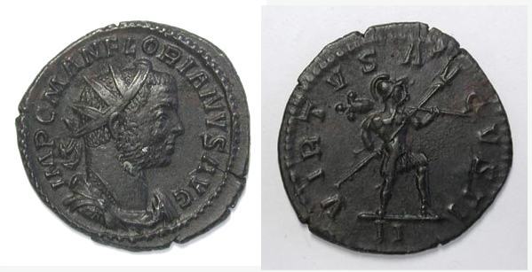 | RIC 47 | Florian AE Antoninianus. IMP C FLORIANVS AVG, radiate, draped and cuirassed bust right / VIRTVS AVG, Florian standing right, holding globe and spear. Mintmark XXIS (XXI digamma). RIC 47, Cohen 97. | Text | ![]() |