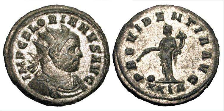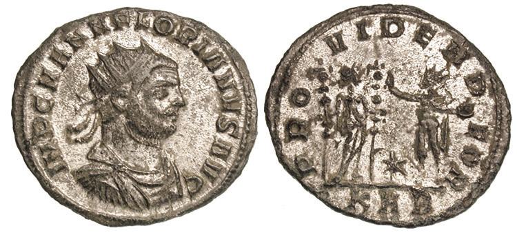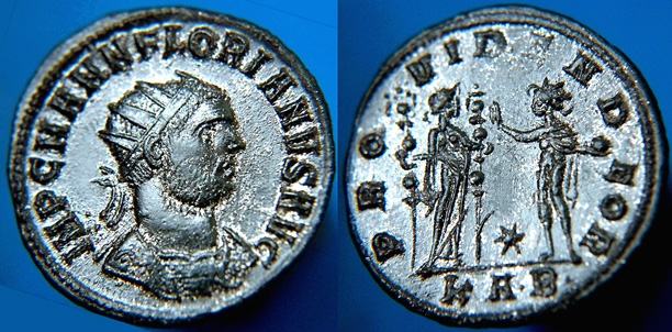 | RIC 10 | Florian Silvered AE Antoninianus. Lyons mint. IMP C M AN FLORIANVS AVG, radiate, draped and cuirassed bust right / PROVIDENTIA AVG, Providentia standing facing, head left, holding in right hand wand over globe at her feet and cornucopiae in left. Mintmark III. RIC 10, Cohen 75; Sear 11870. | Text | ![]() |
