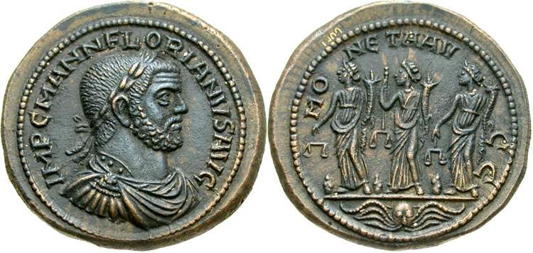 | Gnecchi 2 | Florian, AE medallion, 34 mm, 24.16 gr. 276 AD. IMP C M ANN FLORIANVS AVG, laureate, draped, cuirassed bust right / MONETA AVG, the three Monetae standing left, holding scales in right hands and cornucopiae in left, at their feet to left, a pile of coins of gold, silver and bronze. Cohen 45; Gnecchi 2; Tocci 76. | Text | ![]() |