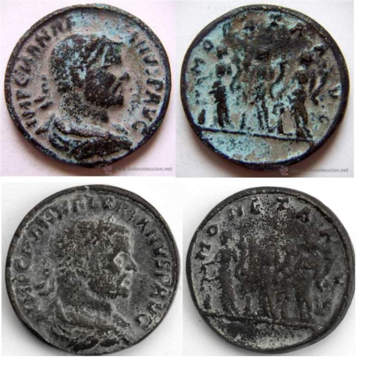| RIC 57 | Florian. AE Antoninianus. Siscia mint. IMP C M AN FLORIANVS P AVG, radiate, draped, cuirassed bust right, seen from the back / CONCORD MILIT, Emperor standing right, clasping hands with Concordia. Mintmark T. RIC 57; La Venera hoard 1944-2 (seen from the back). | Text | ![]() |