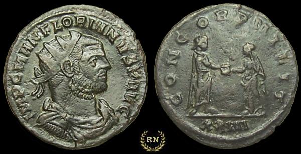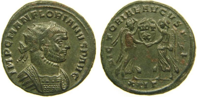 | RIC 116, V | Florian AE Antoninianus. Cyzicus mint. IMP FLORIANVS AVG, radiate, draped and cuirassed bust right / CONCORDIA MILITVM, Victory standing right presenting wreath to Florian standing left. Mintmark V. Cohen 15. | Text | ![]() |