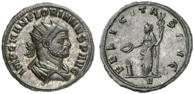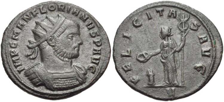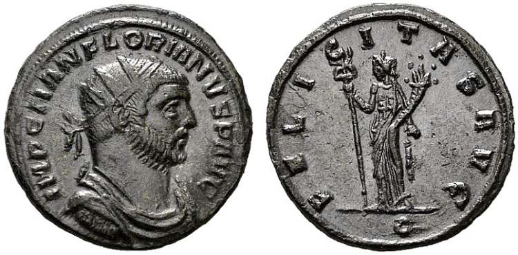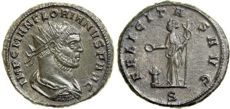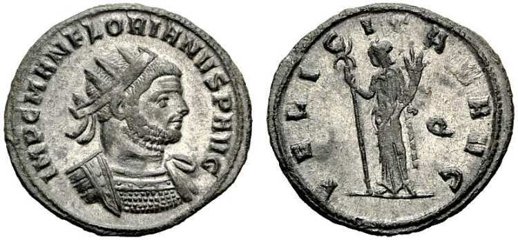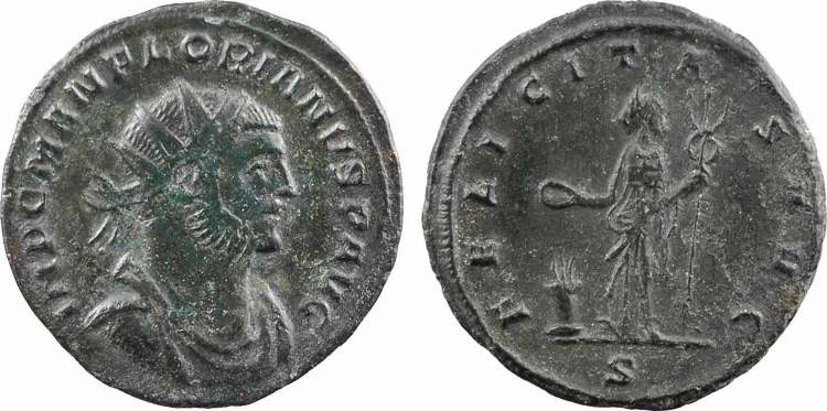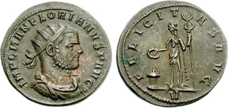 | RIC 61, V rad,cuir | Florian, antoninianus, Siscia, AD 276. IMP C M AN FLORIANVS P AVG, radiate, cuirassed bust right / FELICITAS AVG, Felicitas standing left by altar, holding patera and caduceus. Mintmark V. RIC V-1 Ticinum 61; La Venera hoard 1971. | Text | ![]() |