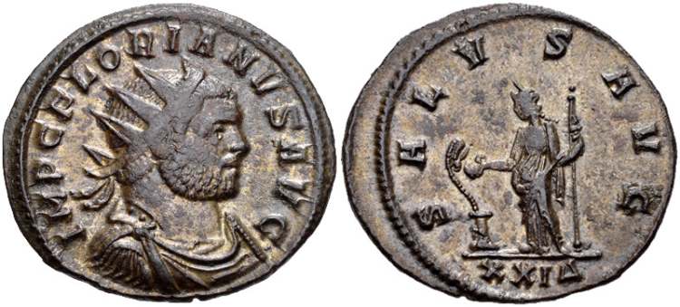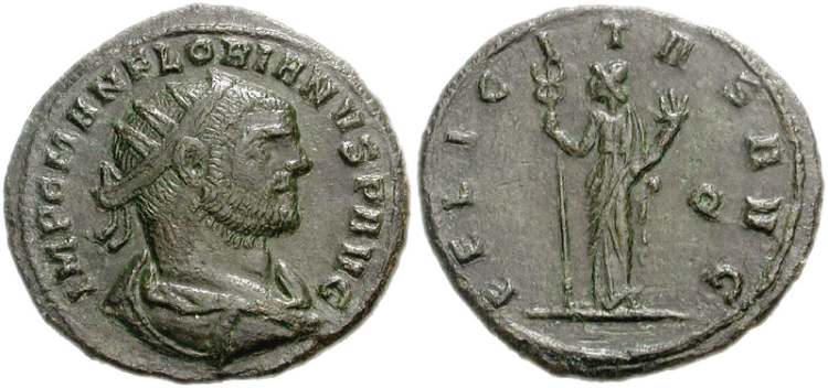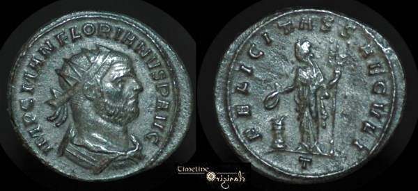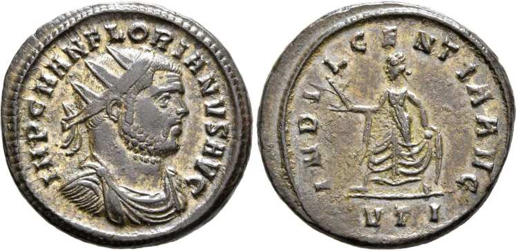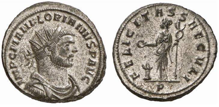 | RIC 61, T rad,cuir | Florian, antoninianus, Siscia, AD 276. IMP C M AN FLORIANVS P AVG, radiate, cuirassed bust right / FELICITAS AVG, Felicitas standing left by altar, holding patera and caduceus. Mintmark T. RIC V-1 Ticinum 61; La Venera hoard 1968. | Text | ![]() |