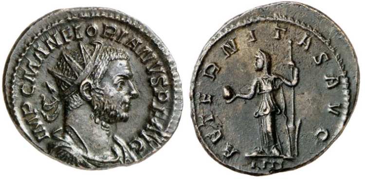 | RIC 2 | Florian AE Antoninianus. Lyons mint. IMP C M AN FLORIANVS P F AVG, radiate, draped and cuirassed bust right / AETERNITAS AVG, Aeternitas standing left holding globe and rudder. Mintmark IIII. RIC 2; Sear 11847; Paris 1862; Cohen 3; La Venera hoard 1927, Bastien 143. | Text | ![]() |