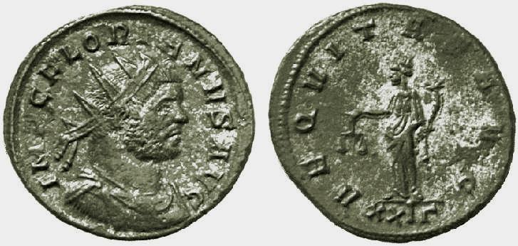 | RIC 25v | Florian AE Antoninianus. IMP C FLORIANVS AVG, radiate, draped and cuirassed bust right / AEQVITAS AVG, Aequitas standing left holding scales and cornucopiae. Mintmark ZIXX (retrograde XXIZ). RIC 25 var (mintmark). | Text | ![]() |