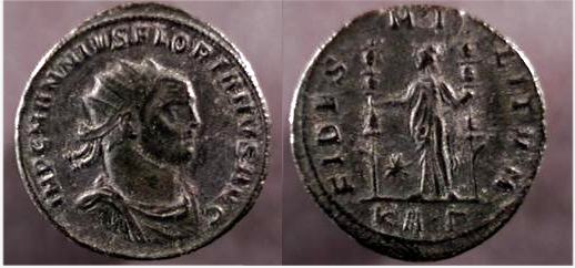 | RIC 30 | Florian AE Antoninianus. IMP C FLORIANVS AVG, radiate, draped and cuirassed bust right / FIDES MILIT, Fides standing left, holding sceptre and ensign. Cohen 25. | Text | ![]() |