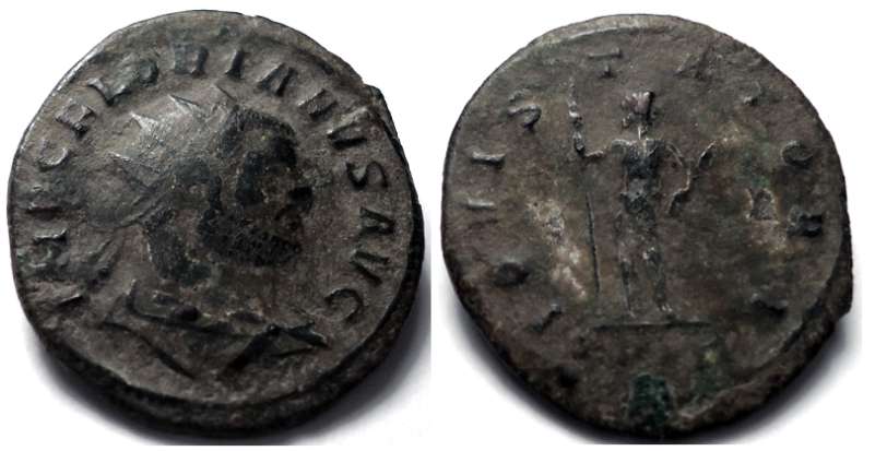 | La Venera 1954 | Florian, AR antoninianus. Siscia mint. IMP C M AN FLORIANVS P AVG, radiate, cuirassed bust right / FELICITAS AVG, Felicitas standing left, holding long caduceus and cornucopiae. Q in right field. La Venera hoard 1954. | Text | ![]() |