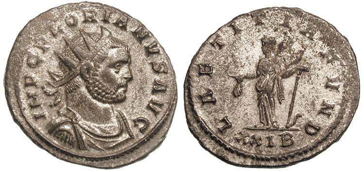 | RIC 34 | Florian AE Antoninianus. IMP C FLORIANVS AVG, radiate, draped bust right / LAETITIA FVND, Laetitia standing left with wreath and anchor, mintmark XXIB. RIC 34, Cohen 38; Sear 11861. | Text | ![]() |