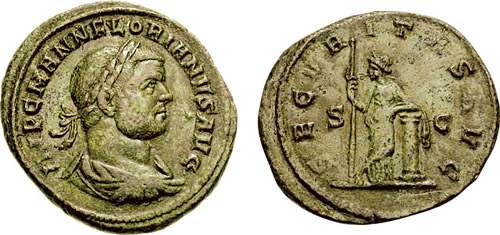 | RIC 53 | Florian AE As. IMP C M ANN FLORIANVS AVG, laureate, draped and cuirassed bust right, seen from behind / SECVRITAS AVG S-C, Securitas standing left, left leg crossed, holding long sceptre in right hand and leaning left elbow on draped column. Cohen 85. | Text | ![]() |