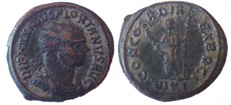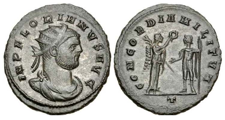 | RIC 116, T | Florian AE Antoninianus. Cyzicus mint. IMP FLORIANVS AVG, radiate, draped and cuirassed bust right / CONCORDIA MILITVM, Victory standing right presenting wreath to Florian standing left. Mintmark T. | Text | ![]() |