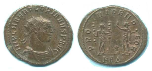 | RIC 111F, Γ | Florian Silvered AE Antoninianus. Serdica, AD 276. IMP C M ANN FLORIANVS AVG, radiate cuirassed bust right / PROVIDEN DEOR, Providentia standing on left facing right, holding two ensigns, opposite her, Sol facing left, raising hand in salute and holding globe. Mintmark KAΓ. | Text | ![]() |