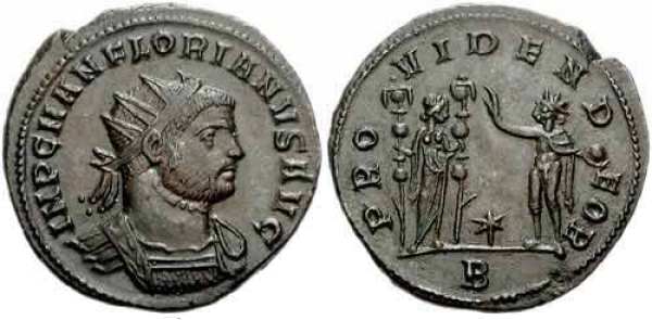 | Estiot 2922 | Florian AE Antoninianus. Serdica mint. IMP C M AN FLORIANVS AVG, radiate and cuirassed bust right / PROVIDEN DEOR, Providentia standing right, holding two ensigns, facing Sol standing left, raising right hand and holding globe; star in lower centre. Mintmark A. RIC -. | Text | ![]() |