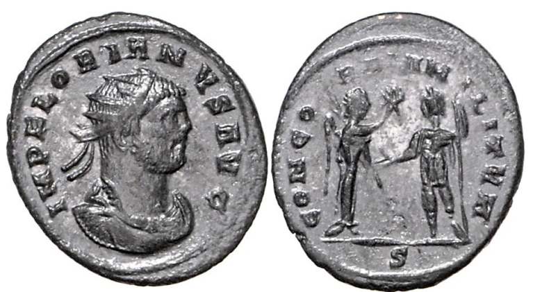 | RIC 116, S | Florian AE Antoninianus. Cyzicus, 276 AD. IMP FLORIANVS AVG, radiate, draped and cuirassed bust right / CONCORDIA MILITVM, Victory standing right, presenting wreath of victory to Florian standing opposite and holding spear. Mintmark S. Cohen 15. | Text | ![]() |
