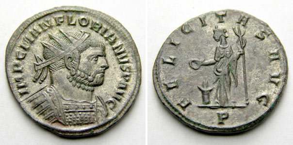 | RIC 61, P rad,cuir | Florian, antoninianus, Siscia, AD 276. IMP C M AN FLORIANVS P AVG, radiate, cuirassed bust right / FELICITAS AVG, Felicitas standing left by altar, holding patera and caduceus. Mintmark P. RIC V-1 Ticinum 61; Sear 11854. | Text | ![]() |