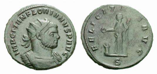 | RIC 61, S rad,cuir | Florian, antoninianus, Siscia, AD 276. IMP C M AN FLORIANVS P AVG, radiate, cuirassed bust right / FELICITAS AVG, Felicitas standing left by altar, holding patera and caduceus. Mintmark S. RIC V-1 Ticinum 61; La Venera hoard 1966. | Text | ![]() |