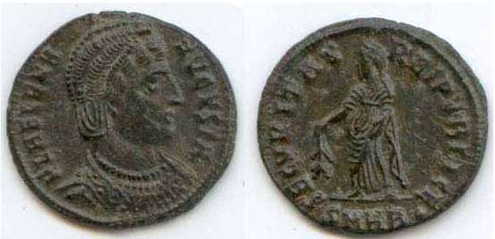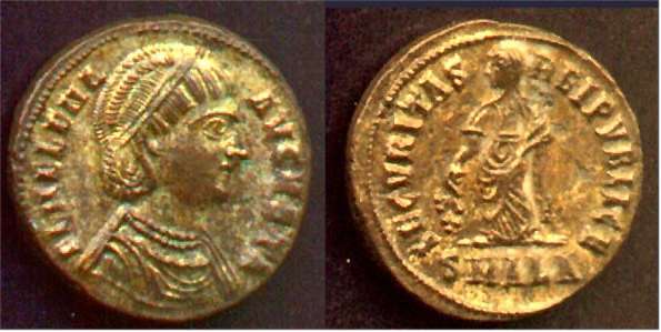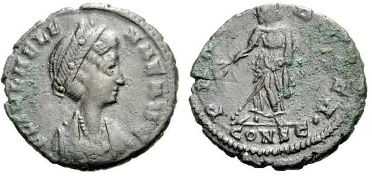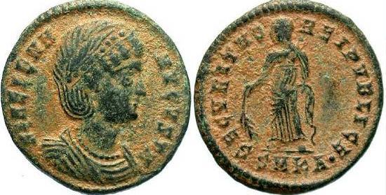 | Antioch RIC 80, B | Helena, AE follis of Antioch. 327-328. FL HELENA-AVGVSTA, mantled bust right wearing necklace and ladder-shaped diadem with a pearl in each section / SECVRITAS-REIPVBLICE, Securitas standing left, lowering branch with right hand, raising hem of robe with left hand. Mintmark SMANTB. RIC VII Antioch 80; Sear 16627. | Text | ![]() |