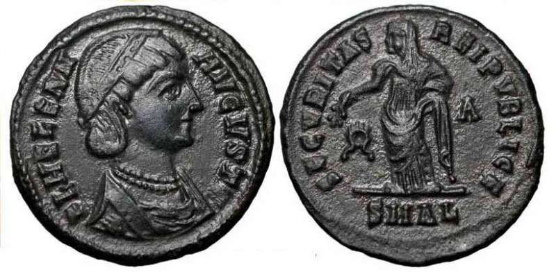 | Alexandria RIC 48, A | Helena AE follis, Alexandria. 327-328 AD. FL HELENA-AVGVSTA, draped bust right, wearing mantle and necklace / SECVRITAS-REIPVBLICE, Securitas standing left, lowering branch with right hand, raising hem of robe with left hand. Wreath in left field, A in right field. Mintmark SMAL. RIC VII Alexandria 48; Sear 16631. | Text | ![]() |