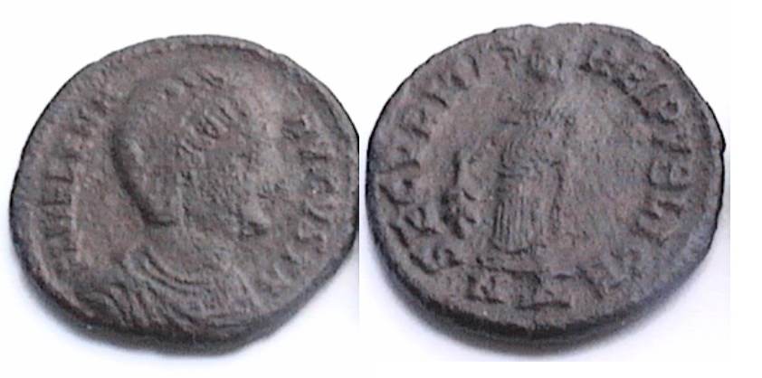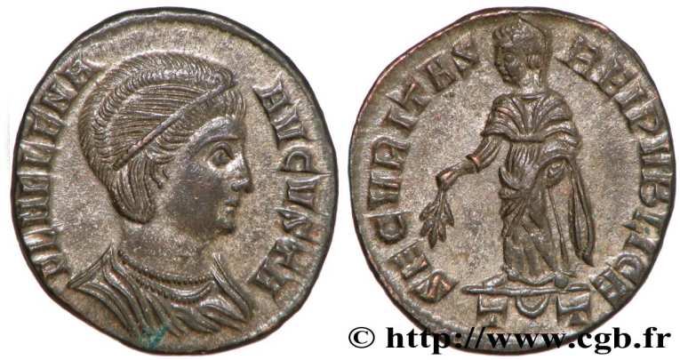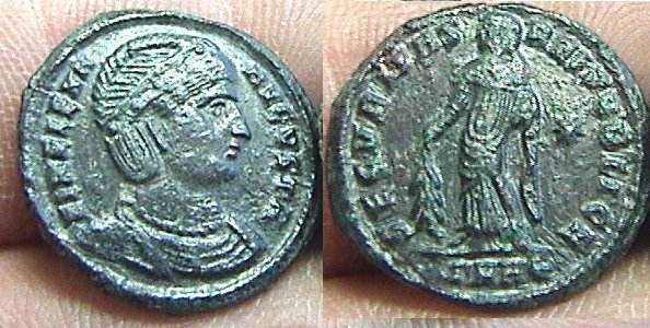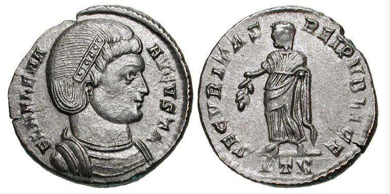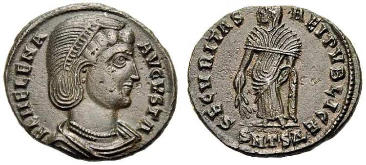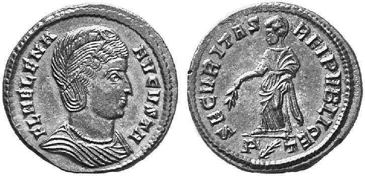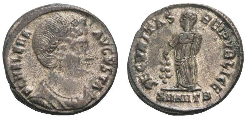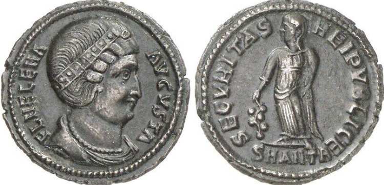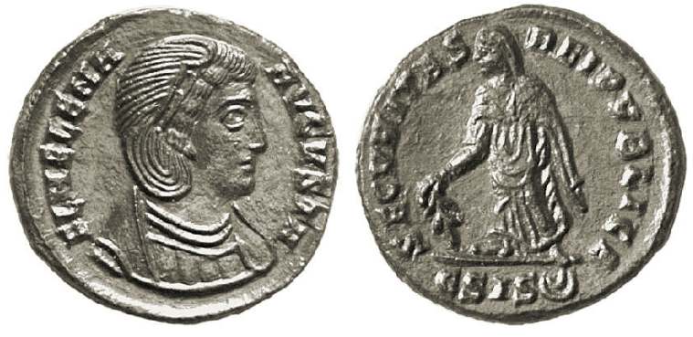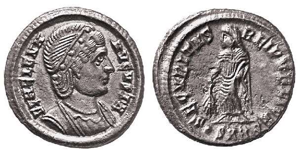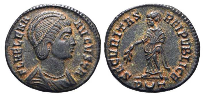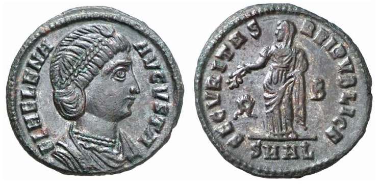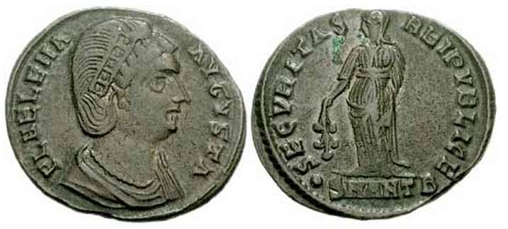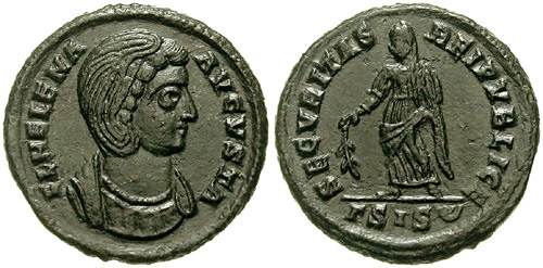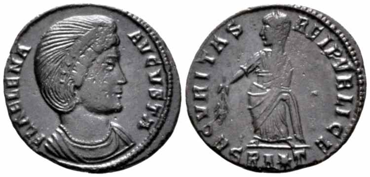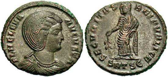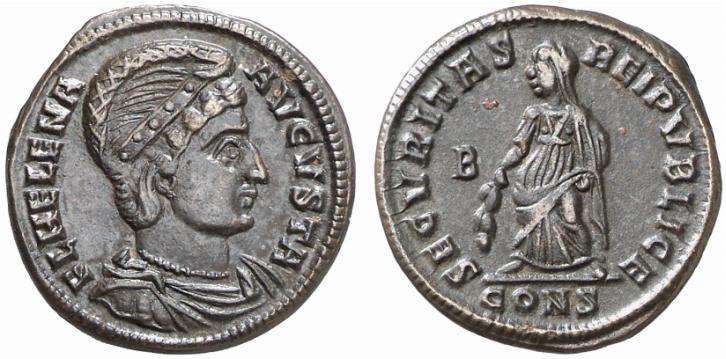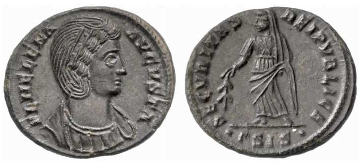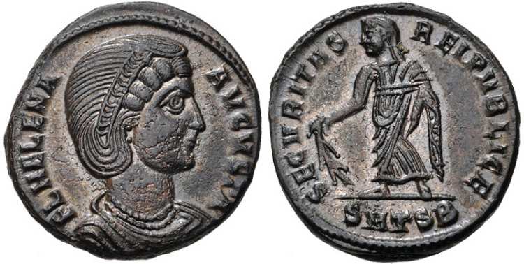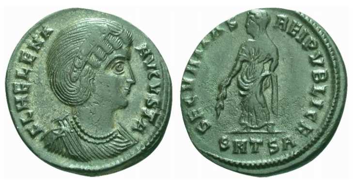 | Thessalonica RIC 159, B | Helena, AE follis, Thessalonica. AD 318-319. FL HELENA AVGVSTA, diademed, mantled bust right, wearing necklace / SECVRITAS REIPVBLICE, Securitas standing left, lowering branch and raising hem of robe. Mintmark SMTSB. RIC VII Thessalonica 159; Sear 16612. | Text | ![]() |