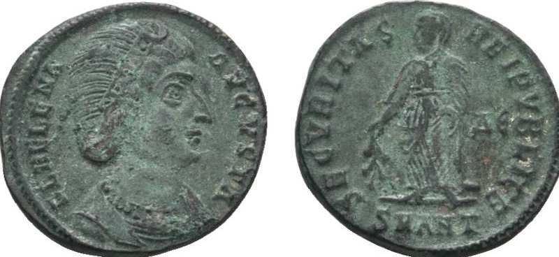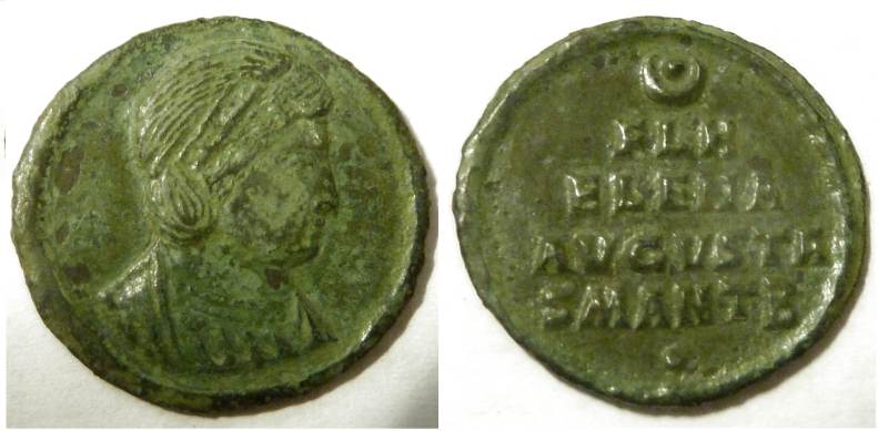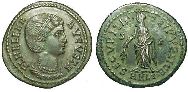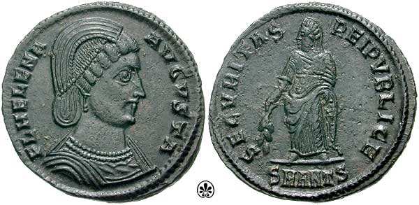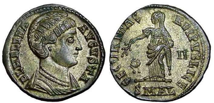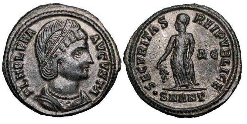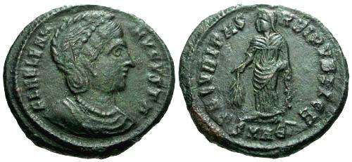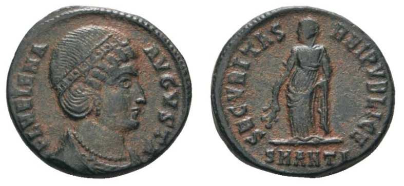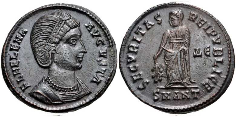 | Antioch RIC 80,A | Helena AE Follis. FL HELENA AVGVSTA, mantled bust right wearing necklace and ladder-shaped diadem with a pearl in each section / SECVRITAS REIPVBLICAE, Empress standing front, head left, holding a branch, mintmark SMANTA. Sear 16627. | Text | ![]() |