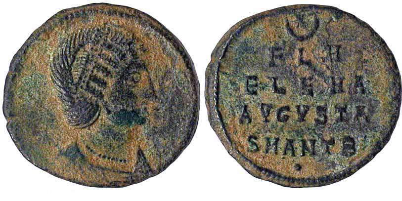 | Nicomedia RIC 95,Δ hair crest | Helena, AE follis, Nicomedia. 20mm, 3.9g. FL HELENA-AVGVSTA, draped bust right with hair in crested Magnia Urbica fashion / SECVRITAS-REIPVBLICE, Securitas standing facing, head left, branch downward in right hand, raising robe with left. Mintmark SMNΔ. RIC VII Nicomedia 95; Sear 16619. | Text | ![]() |
