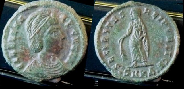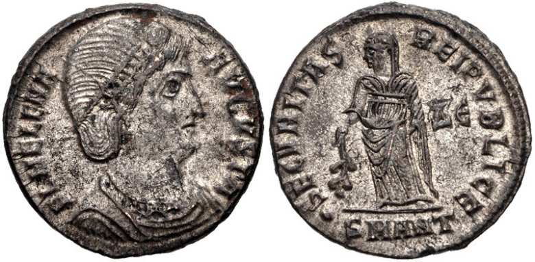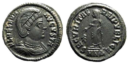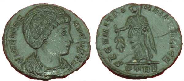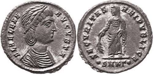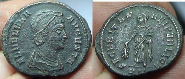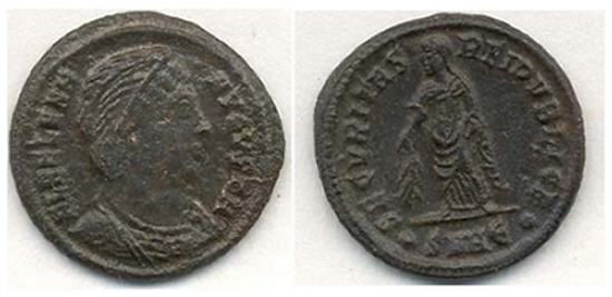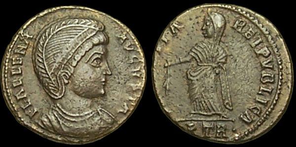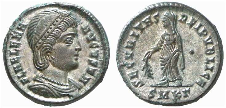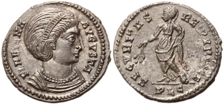 | Trier RIC 78 | Helena AE4. FL IVL HELENAE AVG, diademed and draped bust right / PAX PVBLICA, Pax standing left with branch and sceptre. Mintmark TRP or TRS in ex. | Text | ![]() |
