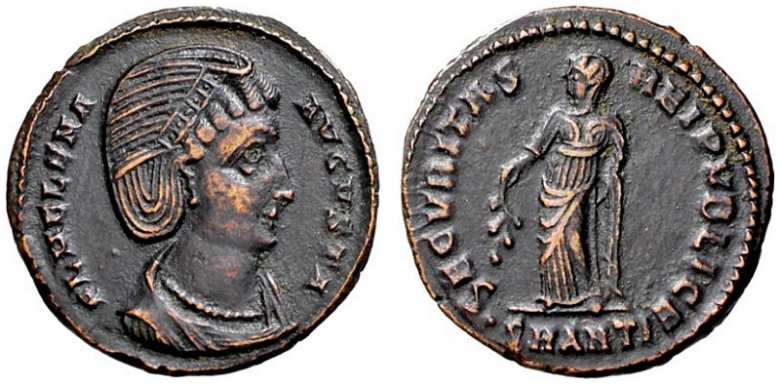 | Antioch RIC 67, S | Helena AE Follis of Antioch. 325-326 AD. FL HELENA AVGVSTA, diademed, mantled bust right, hair in a crest, single row of pearls / SECVRITAS REIPVBLICE, Securitas standing left, holding branch and raising robe, mintmark SMANTS. Sear 16627. | Text | ![]() |