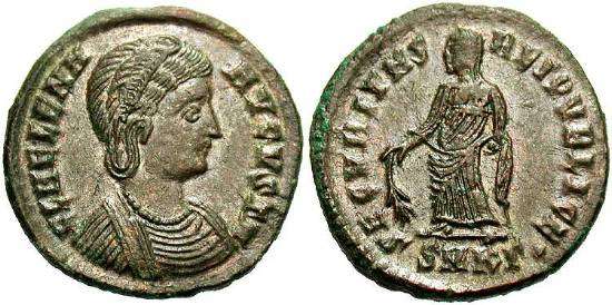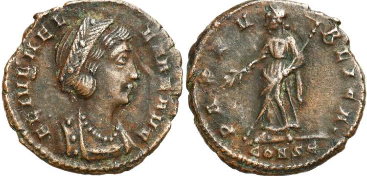 | Constantinople RIC VIII 34 | Helena, AE follis, Constantinople, AD 337-340. FL IVL HEL-ENAE AVG, mantled bust right with broad hairband. / PAX PV-BLICA dot, Pax standing left, holding olive branch and transverse sceptre. Mintmark CONS Epsilon. RIC VIII Constantinople 34; Sear 17497. | Text | ![]() |