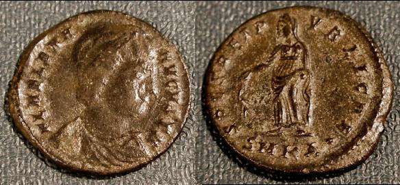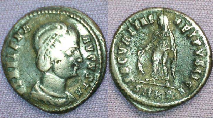 | Constantinople RIC VIII 33,E | Helena AE4. 337-340 AD. F L IVL HE-LENA AVG, diademed and mantled bust right / PAX PVBLICA dot, Pax standing left, holding olive branch and transverse sceptre. Mintmark CONSE. RIC VIII Constantinople 33; Sear 17497. | Text | ![]() |