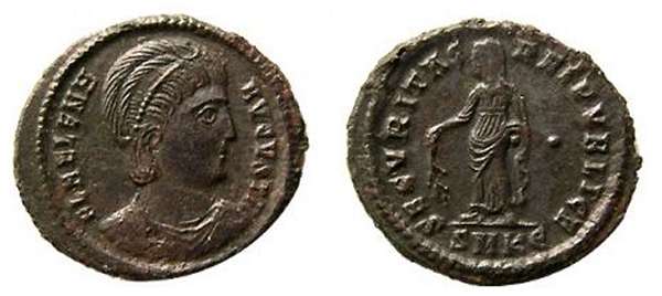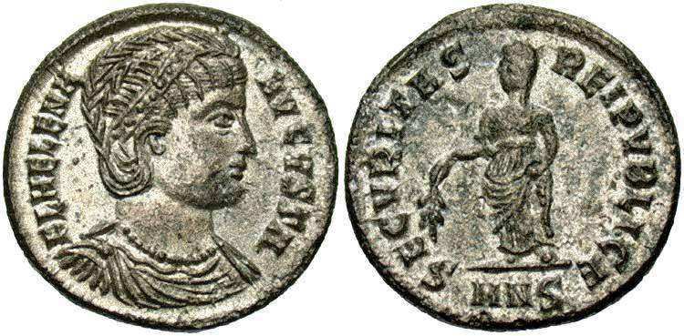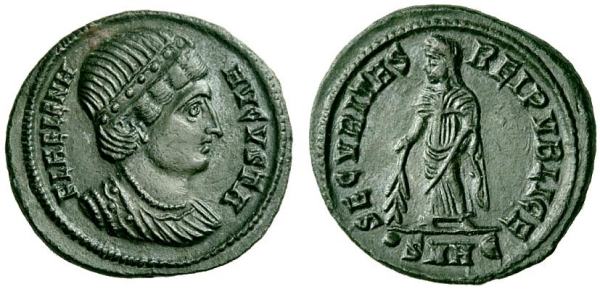 | Thessalonica RIC 159, A | Helena, AE follis, Thessalonica. AD 318-319. FL HELENA AVGVSTA, diademed, mantled bust right, wearing necklace / SECVRITAS REIPVBLICE, Securitas standing left, lowering branch and raising hem of robe. Mintmark SMTSA. RIC VII Thessalonica 159; Sear 16612. | Text | ![]() |