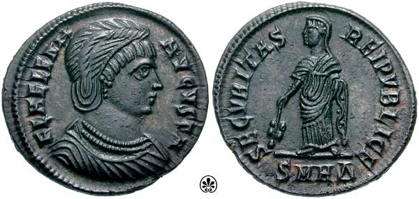 | Heraclea RIC 89 | Helena, AE follis, Heraclea. 326-327 AD. FL HELENA-AVGVSTA, diademed bust right, wearing mantle and necklace / SECVRITAS-REIPVBLICE, Securitas standing left, lowering branch with right hand, raising hem of robe with left hand. Mintmark: dot SMH Epsilon dot. RIC VII Heraclea 89; Sear 16615. | Text | ![]() |