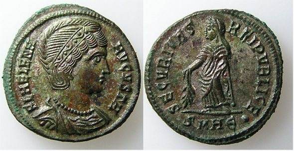 | Nicomedia RIC 129, Δ | Helena, AE follis of Nicomedia. AD 325-326. FL HELENA-AVGVSTA, diademed bust right, wearing mantle and necklace / SECVRITAS-REIPVBLICE, Securitas standing left, lowering branch with right hand, raising hem of robe with left hand. Mintmark MNΔ. RIC VII Nicomedia 129; Sear 16620. | Text | ![]() |